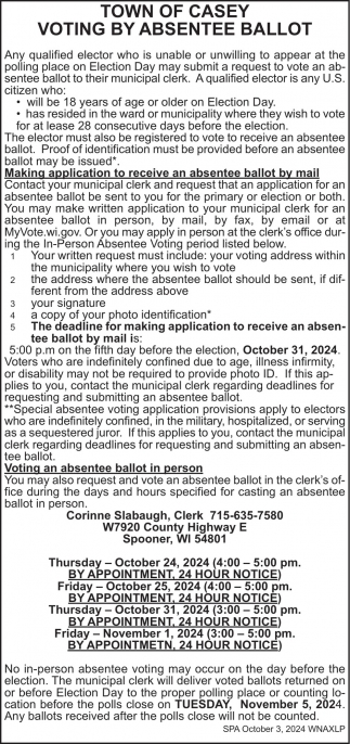 Voting by Absentee Ballot, Town Of Casey, Spooner, WI
