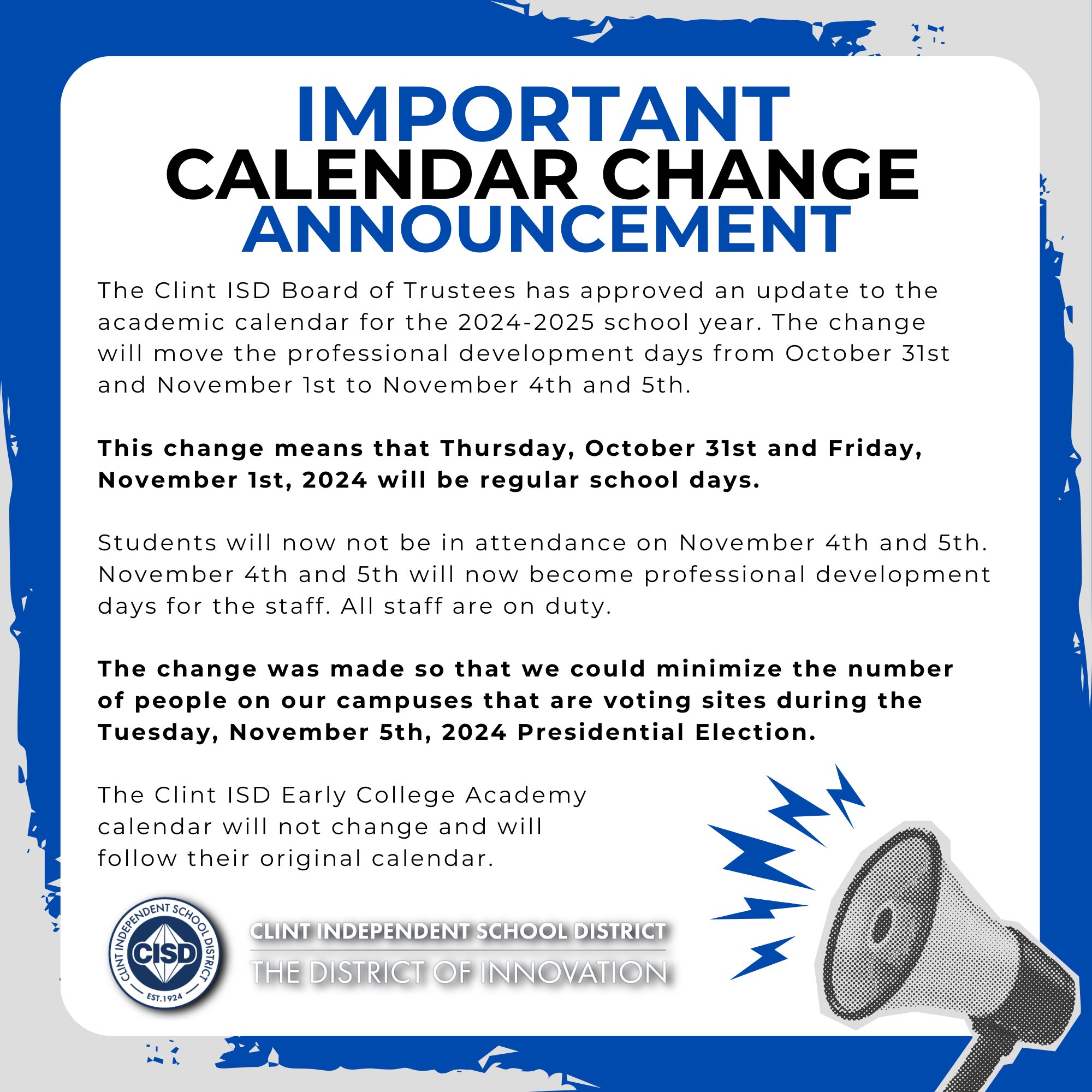 Clint ISD on X: “🚨Calendar Change🚨 The Clint ISD Board of